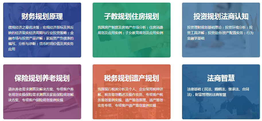 RFP是提供帮助个人/家庭实现理财目标的解决方案的,而客户的理财方案大类来分无非是:资产增值、子女教育、退休养老、保险规划、资产传承、资产保全、税务筹划等内容,而RFP的课程设置完全以此为基础。